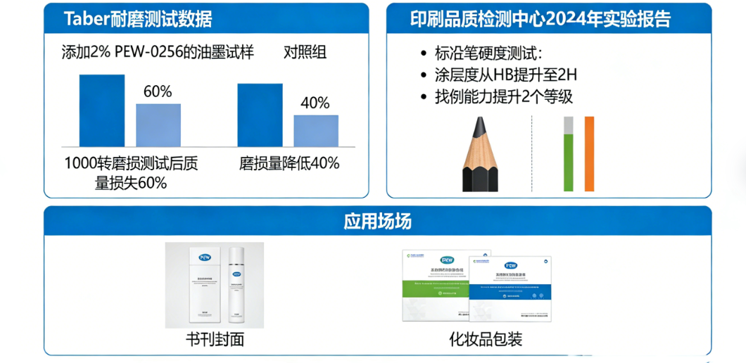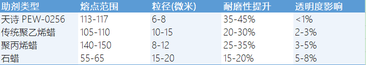 数据清晰地表明,天诗PEW-0256在耐磨性提升和透明度保持方面均优于传统蜡助剂。其独特的粒径分布和熔点设计使其在胶印油墨应用中具有明显优势。