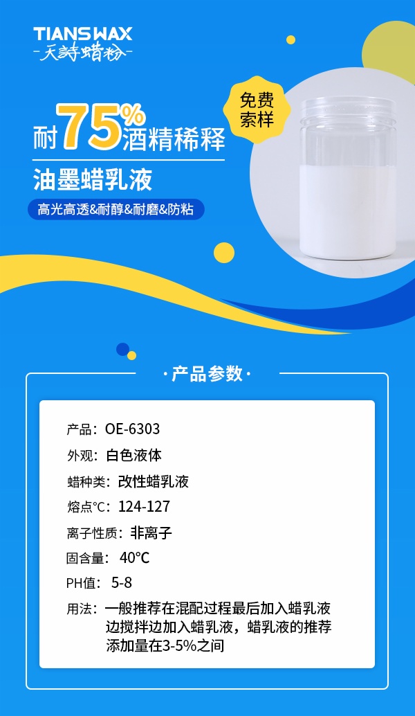性能与应用: 1、OE-6303是非离子改性聚乙烯蜡乳液,不含APEO。在油墨,涂料和套印清漆中具有出色的防粘连性,耐刮伤性和耐磨性,对光泽影响极小。
